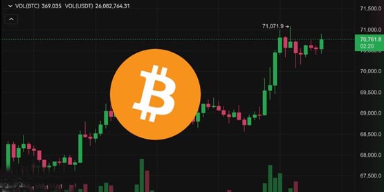 比特币再次突破7万美元大关!比特币在昨(4)晚突破6.9万美元之后,持续震荡上涨。并在今(5)日午夜两点左右最高触及71,071美元,距离历史新高不到3,000美元、约4.2%的涨幅。撰稿当下略有下滑报70,761美元、近24小时小幅上涨2.62%,是否能再创新高,市场持续关注。