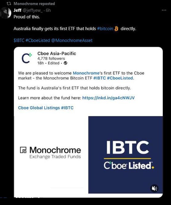 总部位于澳洲的Monochrome Asset Management所推出的比特币现货ETF(IBTC)在6月4日时,正式上线澳洲芝加哥期权交易所(Cboe Australia),实际上澳洲已有两种交易所交易产品(ETP),可在澳洲芝加哥期权交易所提供加密资产现货,但这些ETP并未直接持有比特币。