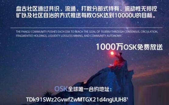 为了更好的拓展市场,社区制定了奥斯卡(OSK)生态链TRC20 USDT流动性打散计划。用户可以通过流动性无损挖矿获取奥斯卡(OSK)币,价值1000万的奥斯卡(OSK)将会进行无损流动性打散激励挖矿,抢完为止。盘古社区通过共识流通、打散分部式持有、流动性无损挖矿以及社区自治的方式推送OSK价值增长,直到每枚OSK价格达到10000USDT。