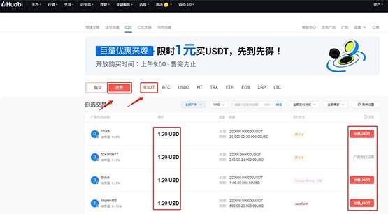 6、选择“出售”币种选择“USDT”,选择商家后,点击商家右侧的“出售USDT”
