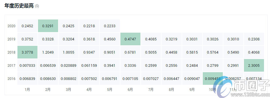 5.2017年,瑞波币开盘价最高2.296美元,最低0.005419美元;