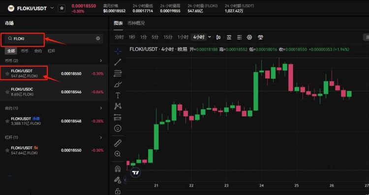 11、在搜索框输入FLOKI,选择FLOKI/USDT交易对,可以看到FLOKI实时行情