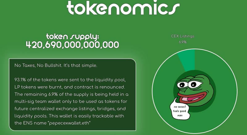 Pepe 币的一个显著特征是其总供应量:PEPE 代币总供应量为420 (大··麻文化中的俚语)兆颗,其中93.1% 的代币注入Uniswap流动性池,只有6.9% 代币保存在一个多签钱包中,仅用作未来中心化交易所上市(现已在Hotbit、MEXC 交易所上架)、跨链桥与流动资金池的资金,该钱包可以透过搜寻ENS 域名「pepecexwallet.eth」找到。
