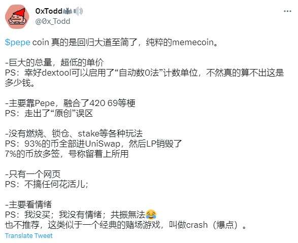 对于PEPE 近来的疯狂暴涨,不少加密KOL 也对此做出分析,其中无为资本合伙人0xTod 就表示:「PEPE 成功的原因在于回归大道至简,真正纯粹的迷因币。」