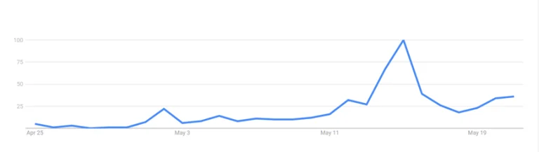 有趣的是,四月对PEPE 来说是一个令人惊奇的月份,而Google搜寻数据也很明显地证明了这一点。从2023 年4 月9 日当周到5 月15 日当周,「PEPE 币」的Google 趋势得分从3 升至100,其中100 分代表了Google 上特定关键字搜寻的最高流行度。