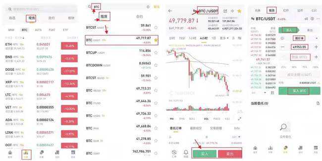 打开app-行情-现货-比特币(BTC/USDT)-买入-填写价格和数量-买入BTC币。