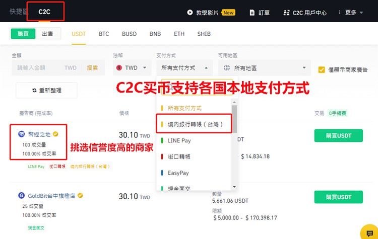 登录币安,选择买币-自选区;首先选择支付方式和商家(卖家),支付方式可以是银行转账、LINE Pay或者街口转账。商家建议选择成交量和成交率高的卖主比较安全。
