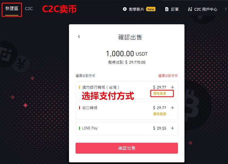 登录币安,选择买币-快捷区;输入购买金额或者USDT的数量。以台湾地区为例,支付方式可以是银行转账、LINE Pay或者街口转账等,点击零手续费购买。
