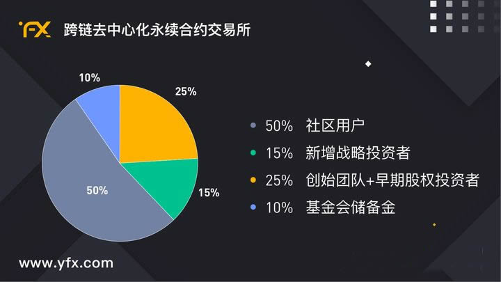 YFX 是 YFX 跨链去中心化永续合约交易平台的平台币,平台币将会在ETH 、BSC、Heco、Tron、OKExChain、Polkadot 等各大公链各发布一部分,YFX平台币总量为100,000,000。YFX代币用于整个去中心化平台的治理。YFX代币采用分期奖励性发放,其中社区通过挖矿或者做市流动性贡献奖励等方式获得,开发团队和前期投资人只拥有少部分币,并且在未来几年时间内线性解锁。