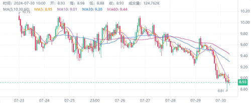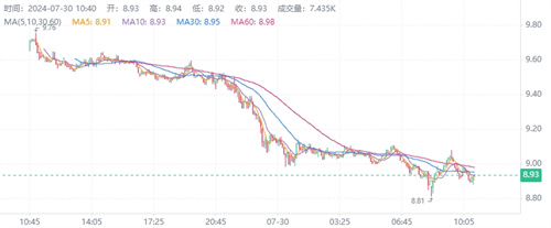 7月29日的开盘价为9.6721美元,随后触及最高价9.8377美元,最低下探至9.4118美元,并最终以9.4967美元收盘。当日24小时交易额为1.13亿美元,市值稳定在43.7亿美元左右。