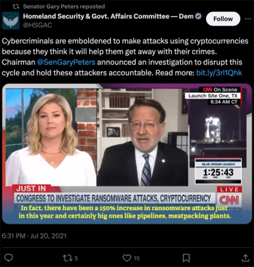 非营利政治倡导组织Stand With Crypto指出,彼得斯对加密货币持强烈反对态度。该组织透露,彼得斯在2023年共同推动了《数字资产洗钱法》的立法,该法案旨在限制加密货币在涉嫌恐怖融资活动中的应用。在法案出台时,彼得斯还致信国家安全顾问杰克·沙利文,要求政府提供更多细节,以说明其防止使用加密货币资助恐怖主义的计划。
