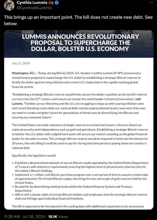 近期,比特币作为美国战略储备资产的议题在政界和加密货币界引起了广泛讨论。在田纳西州纳什维尔举行的2024年比特币会议最后一天,参议员Cynthia Lummis宣布了一项立法提案,旨在将比特币正式纳入美国的战略储备资产范畴。她提出了一项雄心勃勃的计划,即购买比特币总供应量的5%,并作为财政部资产持有,这一提案被形象地称为21世纪的“路易斯安那购买案”。