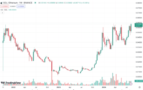8月7日最新消息,随着本周加密货币市场的剧烈震荡,SOL/ETH比率——即一个Solana代币相对于一个以太坊代币的价值——达到了新的历史高点。据TradingView数据显示,8月6日,Solana与以太坊的汇率达到了0.0595的新高,当时Solana价格为143美元,而以太坊价格为2445美元。