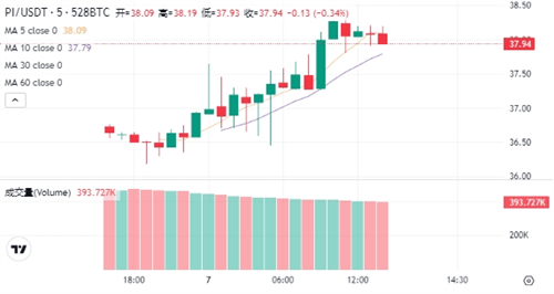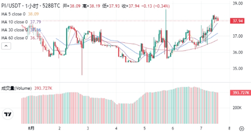 2024年8月1日,Pi币以38.49美元的高价开盘,随后在盘中一度上涨至38.8234美元的峰值,但随后遭遇抛压,最低跌至36.7946美元。收盘时,价格稳定在37.586美元。当日交易额为63.66万美元,市值达到25.55亿美元。