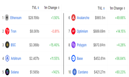 BSC Chain 目前持有 36 亿美元的锁定总价值(TVL),这是其智能合约中的存款总和,仅占以太坊 282 亿美元的不到 13%。更重要的是,它低于以太坊顶级扩容解决方案(即 Arbitrum、Optimism、Polygon 和 Base)所持有的 46 亿美元。虽然 BSC Chain 的 TVL 在过去 30 天内增长了 25%,但 Solana 和 Avalanche 等其他现有企业在同一时期分别增长了 142% 和 50%。