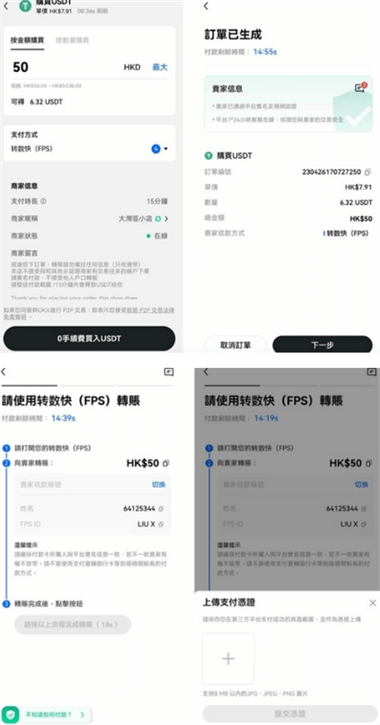 3、点击【购买】后,您需要输入希望购买的金额,并勾选【0手续费买入USDT】选项(以USDT为例,若选择BTC则相应调整),这样系统会自动为您生成买入订单。在订单页面,点击【下一步】继续,然后按照页面显示的卖家收款账户信息完成转款操作。付款完成后,务必返回OKX的订单页面,点击【我已付款】并上传您的付款凭证。等待卖家确认收款并放行相应的虚拟货币后,交易即完成。