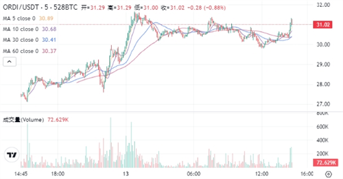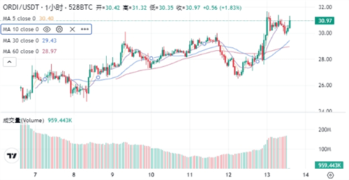 据当前的最新行情数据显示,ordi币当前的最新价格为:$31.2,在当前的24小时内ordi币价格上涨: 15.44%,24小时最高价格为:$31.671,24小时最低价格为:$27.1。