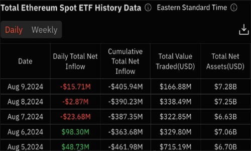 此外,Grayscale的以太坊信托基金在本周遭遇了1.8亿美元的资金流出,若不计入这一因素,九只ETF的总流入量将更为可观。尽管如此,Grayscale的现货以太ETF资产持续流出已累计达23亿美元,导致所有九只基金的总流出量仍高达4.064亿美元。