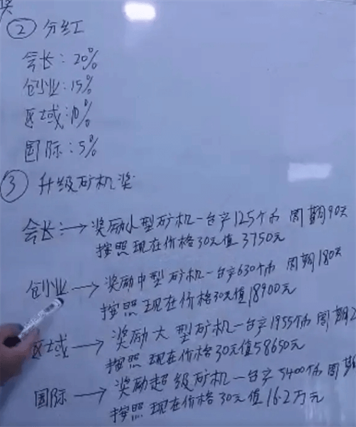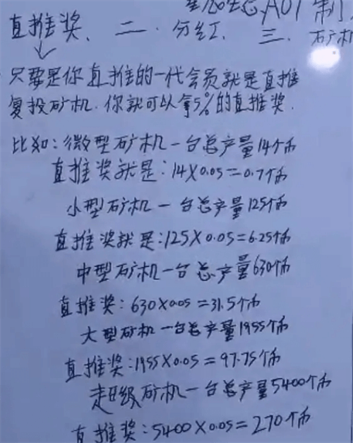 更为严重的是,AOT慈善币项目在矿机端和客户端都存在拉人入伙、发展下线的行为。根据多位代理提供的内部收益图,用户通过直推会员可以获得算力奖励或额外收益,这种多级奖励机制明显带有传销色彩。