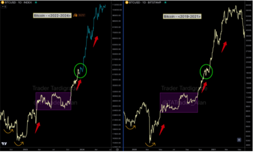 自2022年底以来,BTC/USD的最新多年低点,价格复苏实际上遵循了2020-2021年的模式。