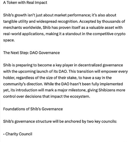 “Shib 正准备通过即将推出的 DAO 成为去中心化治理的关键参与者。这一转变将赋予每个持有者权力,无论其股份大小,都能对社区的方向发表意见。”