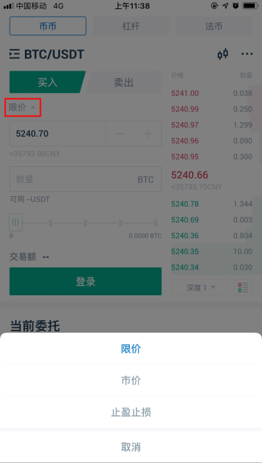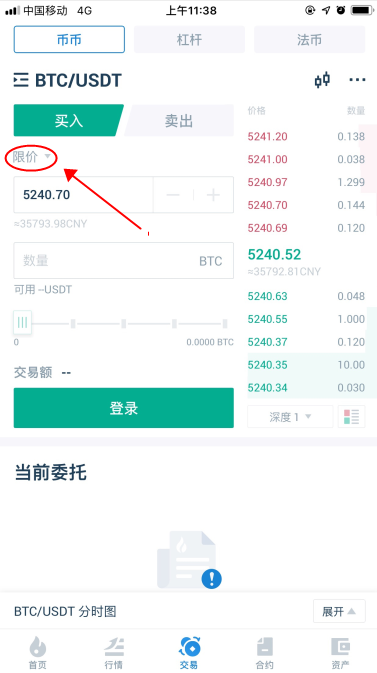 4. 然后可以根据自己的需要,来选择限价/市价交易。所谓的限价交易就是挂单交易,你可以自己设定买入/卖出价格,等市场价格波动到自己设定的价格便可成交;当卖出挂单价格低于当前市场价格,会按照市价成交;当买入的挂单价格高于当前市场价格,会按照市价成交。