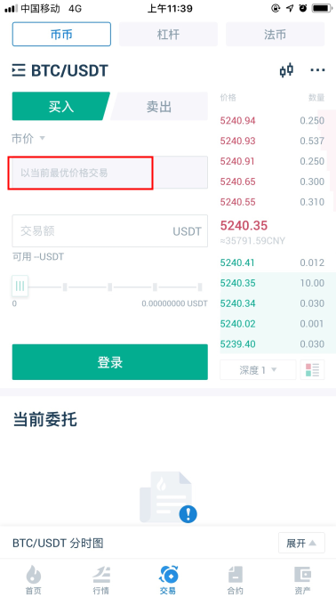5. 所谓的市价交易就是指不设定买入价格,按照当时的市场价格买入或卖出,只需输入想买入的总金额或卖出的总量即可:
