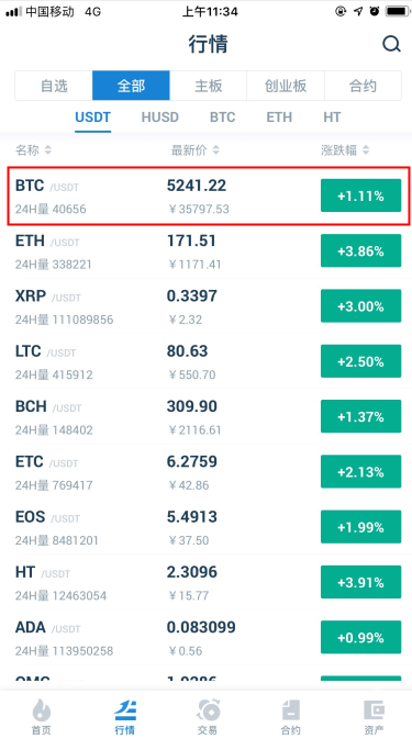 1. 打开火必APP,没有账号的投资者点此注册新账号,登录后,选择底部“行情”按钮,进入行情列表界面,在这里可以看到各个币种的当日行情: