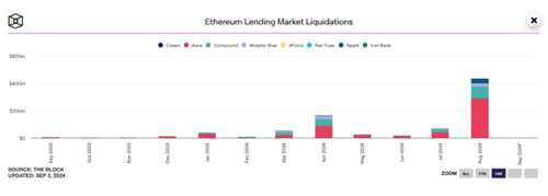 这波下跌导致以太坊链上出现大规模清算。据The Block数据,8月以太坊链上借贷市场的清算总额超过4.36亿美元,成为历史上第二大链上清算月份,仅次于2021年5月的6.71亿美元。