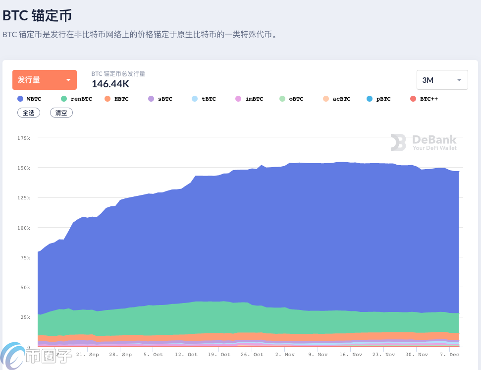 在这其中,WBTC上线最早,占据的份额也是最多的,从上图可以看出,当前发行量接近12万枚。