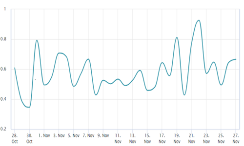 11 月 24 日至 26 日期间,比特币期货溢价徘徊在 12% 左右。然而,到 11 月 27 日,随着比特币价格测试 37,000 美元的支撑位(中性水平,但接近看涨阈值),比特币价格跌至 9%。