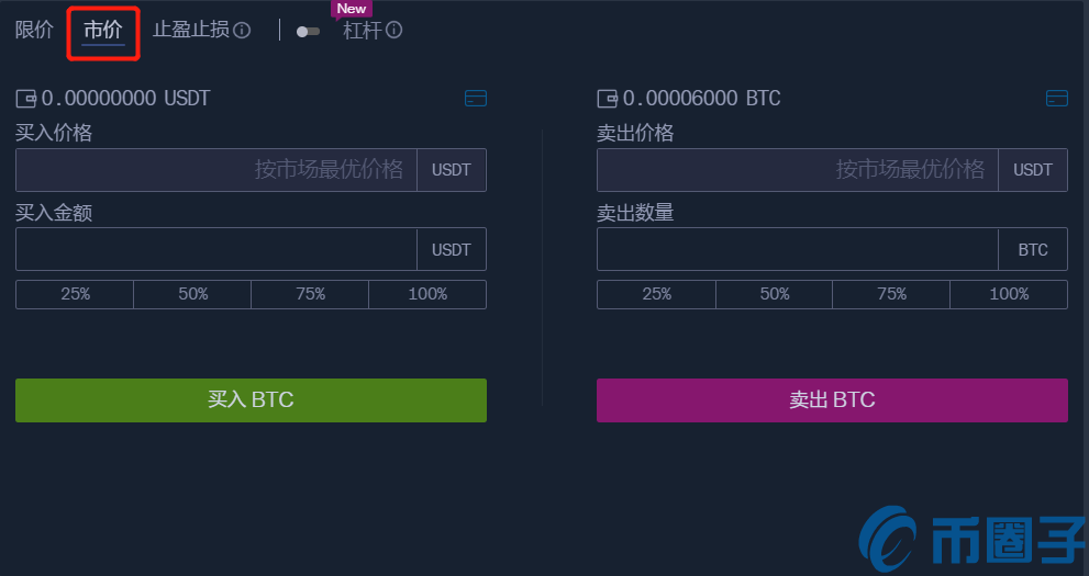 7.所谓的市价交易就是指不设定买入价格,按照当时的市场价格买入或卖出,只需输入想买入的总金额或卖出的总量即可。市价交易界面如下图所示: