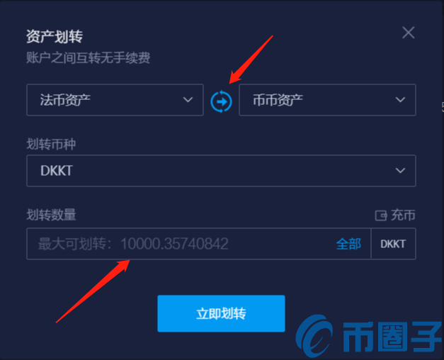 3.选择从法币资产 ⇌ 币币资产,输入需要划转的DKKT数量,点击“立即划转”即可成功划转。