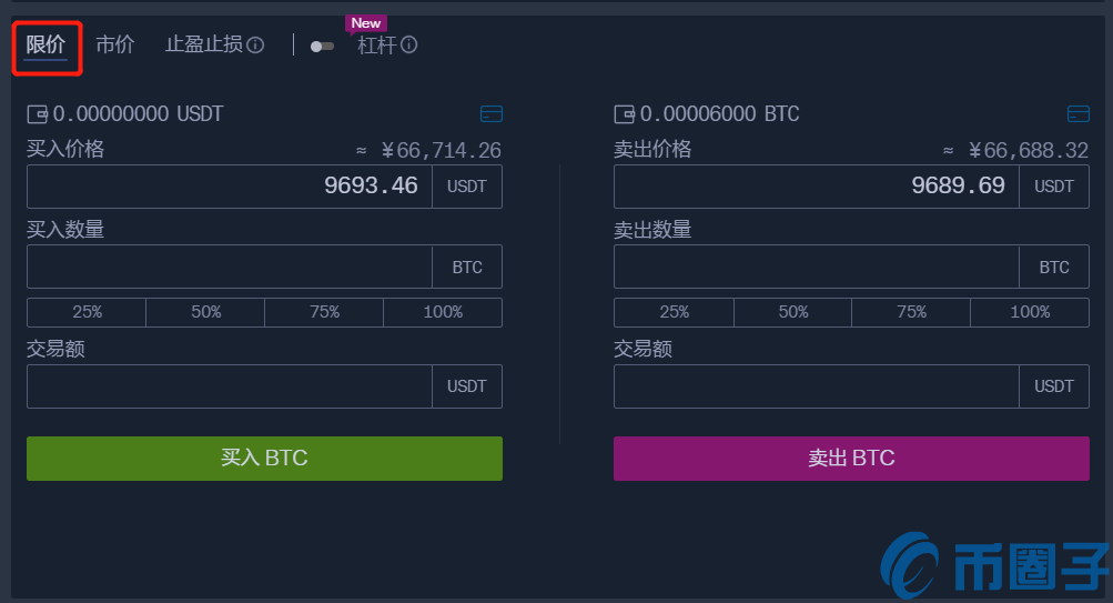 6.您可以根据自己的需要,来选择限价/市价交易。所谓的限价交易就是挂单交易,你可以自己设定买入/卖出价格,等市场价格波动到自己设定的价格便可成交。当卖出挂单价格低于当前市场价格,会按照市价成交;当买入的挂单价格高于当前市场价格,会按照市价成交。限价交易界面如下图所示: