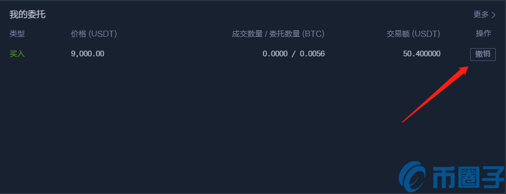 8.在交易页面下面,【我的成交】中可以查看成交记录,【我的委托】中可以查看未成交的挂单,委托列表中可以撤销挂单。