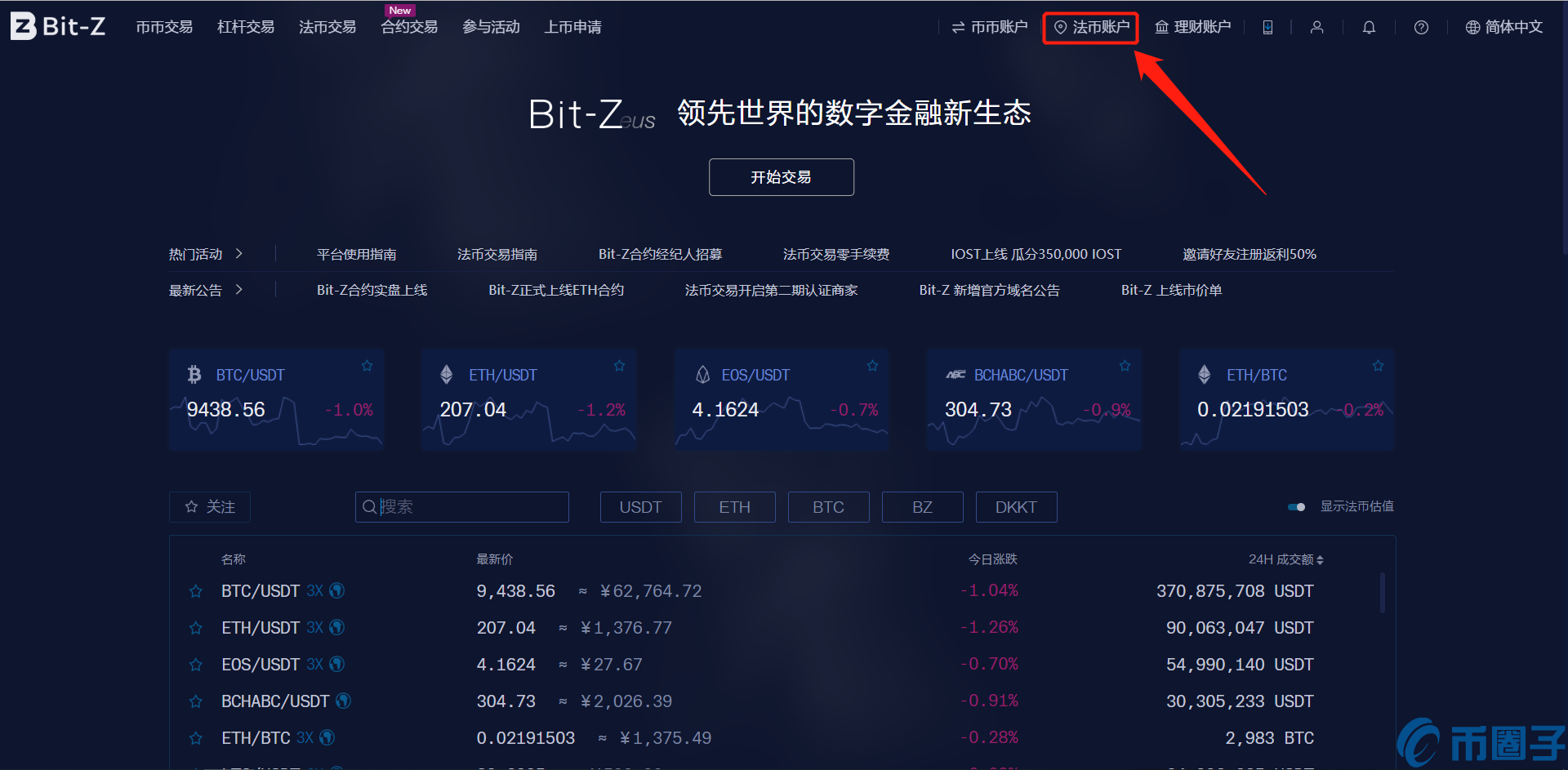 1. 登录Bit-Z官网,没有账号可以点击注册一个账号 找到【法币账户】,点击进入。