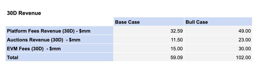 在基准场景下,30天收入可达5900万美元;在乐观场景下可达1.02亿美元。估值采用主流L1公链的市盈率倍数,结合年化收入进行计算。