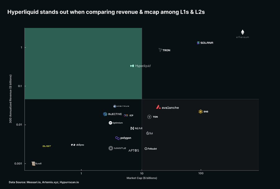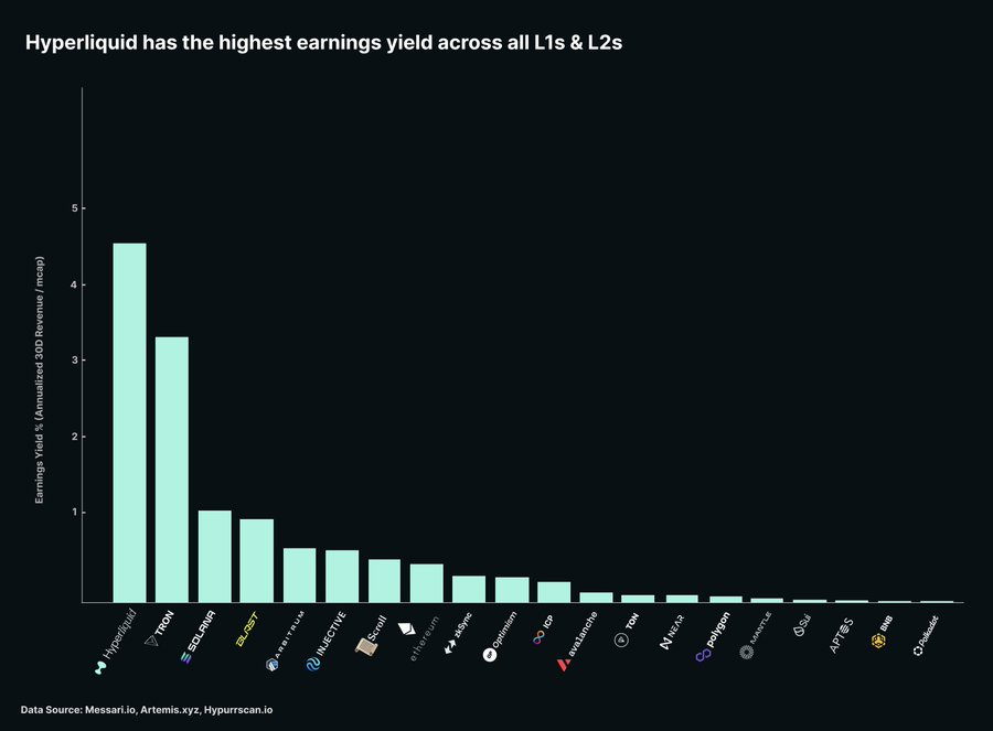 年化收入超过3.36亿美元,在所有公链中仅次于以太坊、Solana和波场,但市值显著低于这些公链。从收益率(年化收入/流通市值)来看,Hyperliquid远超其他L1和L2。