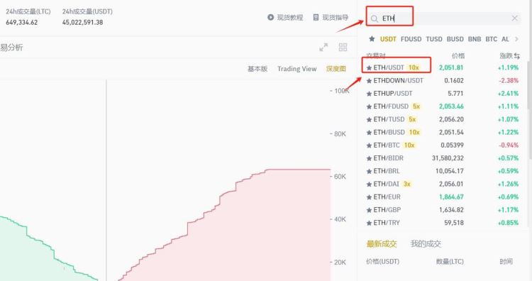 7、搜索币种简称【ETH】,选择【ETH/USDT】交易对