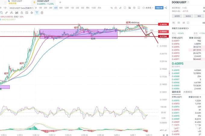 狗狗币目前在0.4美金徘徊震荡,根据狗狗币的形态走势来看,中期依旧是持续往下走的。