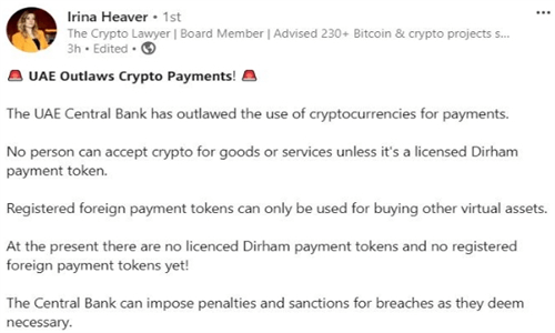 6月27日消息,阿拉伯联合酋长国(UAE)近日发布的新法规可能禁止国内加密货币支付,这一观点得到了加密和区块链领域律师伊琳娜·海弗(Irina Heaver)的确认。