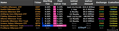 相比之下,灰度以太坊信托(ETHE)则因其高昂的2.5%长期管理费而备受关注。不过,灰度也推出了新的迷你信托基金,以更具竞争力的收费结构应对市场挑战。在迷你信托基金上市初期,灰度将0.25%的基准费用下调至0.12%,优惠期同样为12个月或资产管理规模达到20亿美元为止。