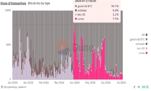 随着Runes热度的减退,其他比特币协议如BRC-20和Ordinals虽仍保持一定活跃度,但整体交易份额远低于Runes的鼎盛时期。7月17日的数据显示,Runes仅占所有交易的7.9%,而BRC-20和Ordinals则分别仅占1.1%和0.4%。