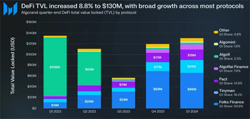 Pact和Tinyman也取得了显著的增长,在第一季度分别占据了约15%和18%的DeFi TVL市场份额。AlgoRai金融的增长最为显著,其TVL季度增长了53%。
