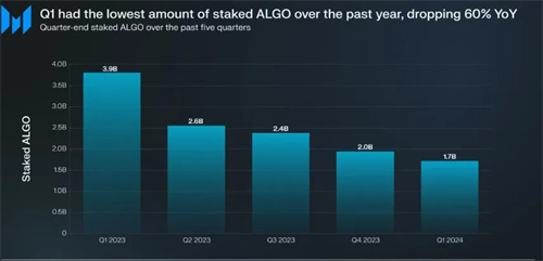在2024年第一季度,ALGO对Algorand平台的治理承诺同比下降60%,季度环比下降3%,达到一年来的最低水平,为17亿ALGO股份。