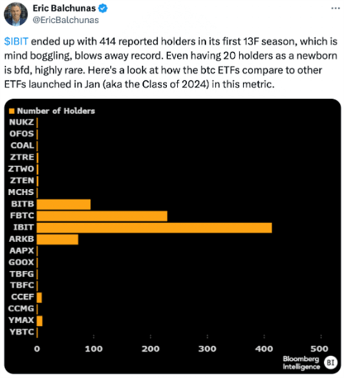 彭博社资深ETF分析师Eric Balchunas观察到,最大的ETF吸引了最大部分的机构资金,其中贝莱德的IBIT吸引了400多名持有者。