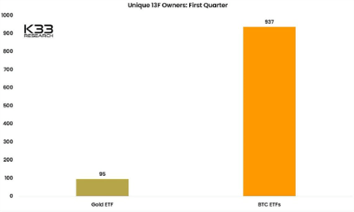 “根据13F报告,截至3月31日,有937家专业公司投资了美国的现货ETF。相比之下,第一季度投资黄金ETF的专业公司只有95家(Bitwise)。”