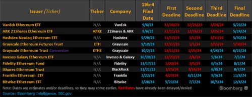 相比之下,现货以太坊ETF的审批流程显得更为艰难。自2023年9月起,以太坊现货ETF的申请便陆续递交,随后的10月和11月更有多份申请接踵而至。直至2024年第一季度,最后一批申请也已完成提交。然而,尽管过去八个月中活动频繁,随着第一波申请的最终截止日期——2024年5月渐行渐近,SEC却迟迟未给出批准的信号。
