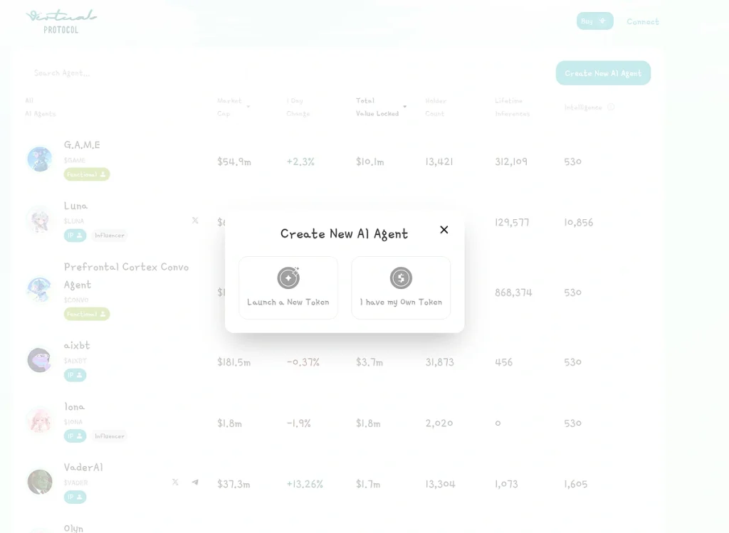 - 创建、拥有和管理人工智慧代理:所有AI 代理代币购买都必须透过$VIRTUAL 进行,以确保需求的一致性,就像以太坊中的ETH 一样。建立新AI 代理程式时也需要支付固定数量的VIRTUAL。