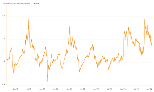 当SSR值较低时,稳定币拥有更多的购买力来购买BTC供应。